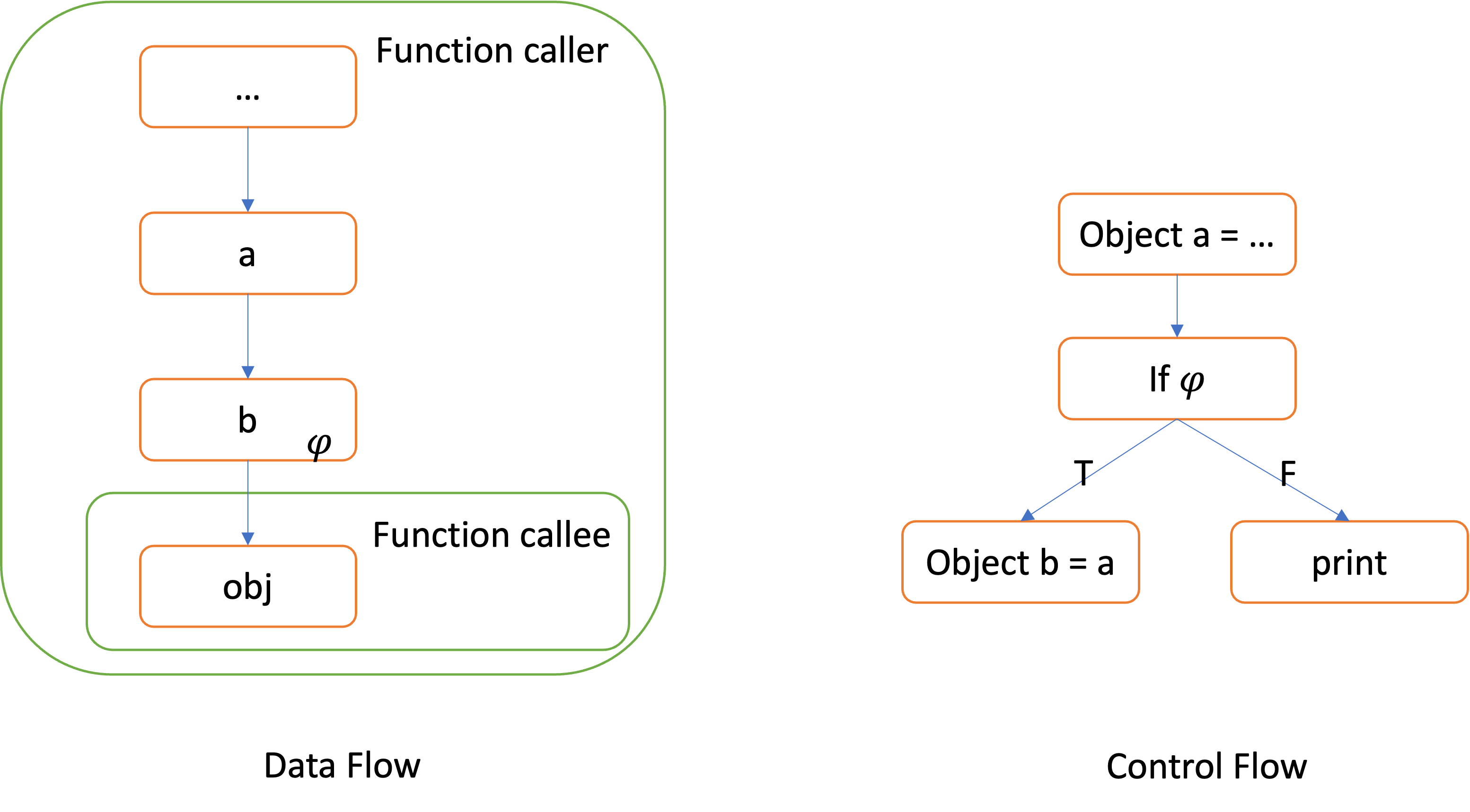 which correspond to two different execution paths in the program. A path-sensitive analysis not only infers that {a,c} may flow to obj, but also knows the paths p1-p2 taken for {a,c} to flow into obj.